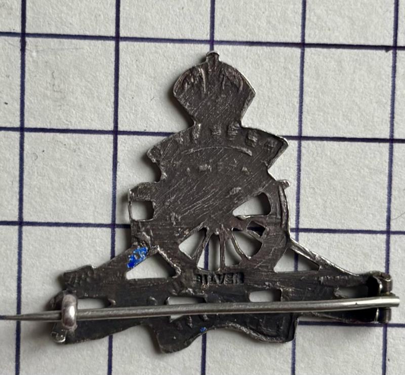 R.A. King's Crown Pre-1952, marked 'SILVER' and enamel badge with functioning pin. GC.