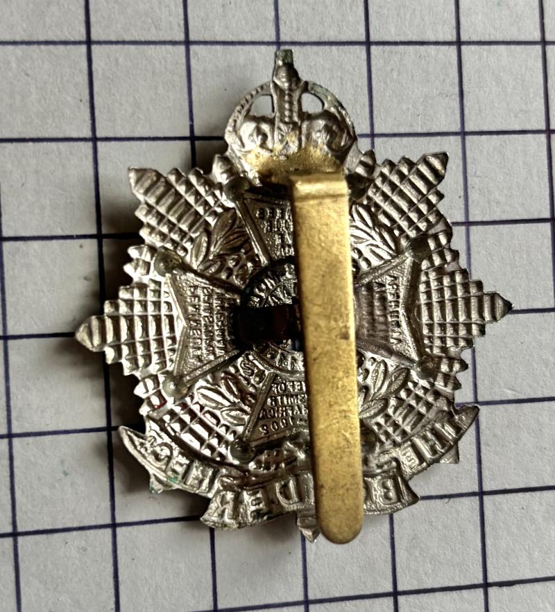 The Border Regt Other Ranks White Metal Cap Badge this pattern sealed in July 1905 and worn until 1953. Missing the red felt backing that shoulder be inserted in behind the brass retaining strip. VGC.